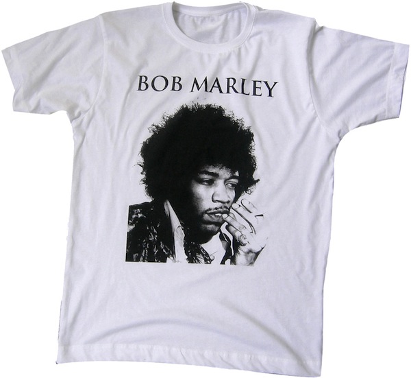 African Apparel is a British company with a wicked sense of humor, whose primary M.O. is sending up cliched music T-shirts. Their “John Marley” deliberately and hilariously mixes up the giants of generic rock icon Ts: a picture of Jimi Hendrix is matched with the caption “Bob Marley”; presumably the “John” in the T’s name is Lennon. (Update: This shirt is a tribute to an actual tattoo some idiot got. Thanks, Matt Goias). Get it for £20 (about $31) through their web store, or wait til after the holidays and scoop it at the soon-to-open Miss Lily’s Variety store in NYC.